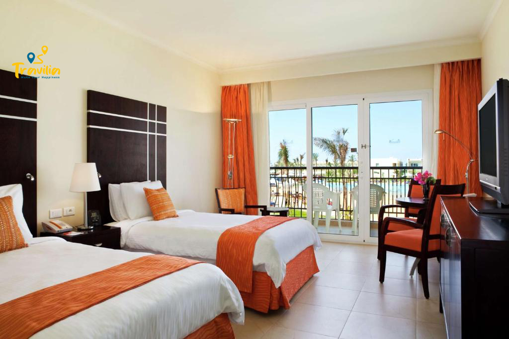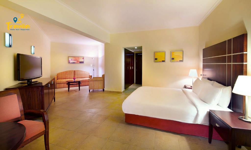 • تحتوي جميع الغرف على شرفة خاصة، كما يتوفر تلفزيون بشاشة مسطحة وثلاجة، ويشمل الحمّام حوض استحمام ورداء حمّام.