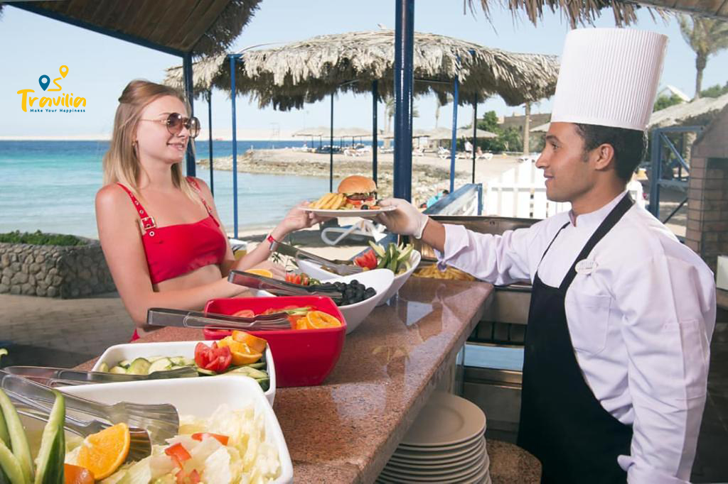 • Dining options include El-Zahra Restaurant which serves international cuisine, and IL Foro which offers a variety of Italian specialties. Shark Stop, Beach Bar and Pool bar feature light snacks and refreshing beverages.