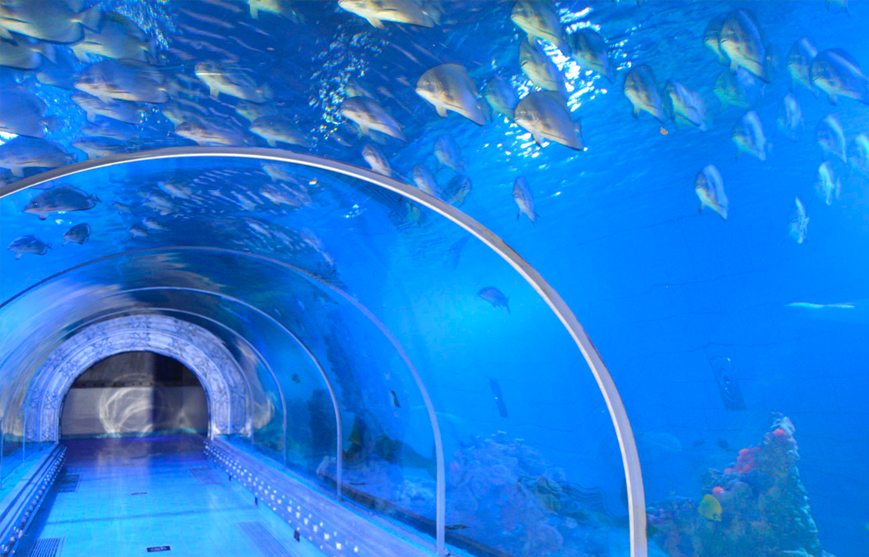 • You can walk through the glass tunnels and watch the fish swimming around you, or admire the dolphin and whale shows.
