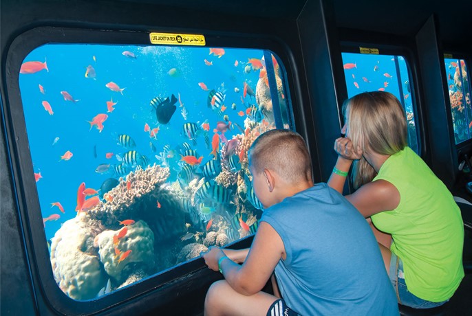 • After that, the submarine is boarded to descend to a depth of 4 meters to watch the marine life in its various forms and types, where you see many colorful fish and corals that are separated from you only by glass.