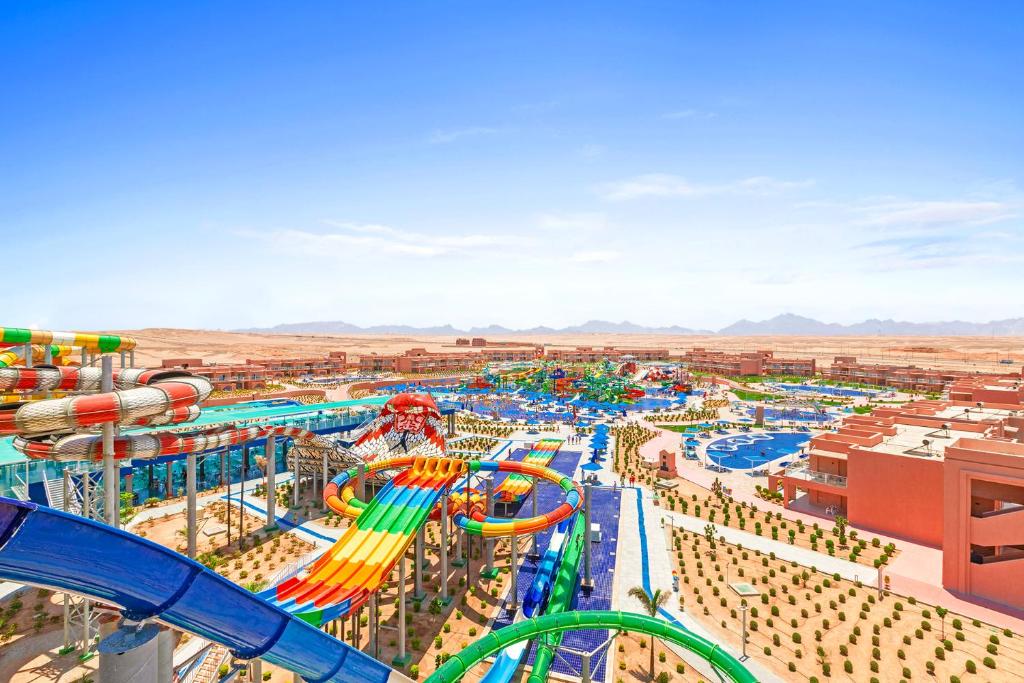 • Boasting 32 pools: 1 heated pool for adults, 1 heated pool for children, 11 water slides and 19 swimming pools, this resort in Hurghada is a true water theme park. Its rooms feature a terrace or balcony overlooking the pools or the resort’s gardens.